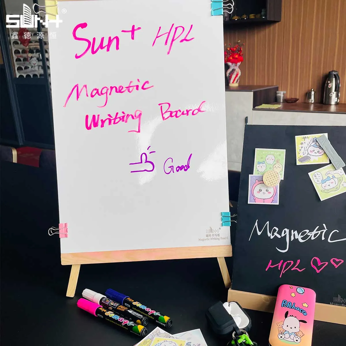Medium UseIndispensable for design studios, advertising agencies, and creative teams who need flexible wall surfaces for mood boards, design iterations, and client presentations. Designers can sketch concepts directly on the surface with markers while pinning inspiration images, color swatches, and material samples using magnets. The combination of writable and magnetic functionality supports the iterative design process where ideas evolve through multiple revisions. Creative teams use the surface for storyboarding, where scene sketches can be combined with magnetic frame cards and narrative notes. Advertising agencies create campaign planning walls where creative concepts, target audience profiles, and media strategies are visualized using a mix of written content and magnetic visual elements. The white or light gray surface provides a neutral backdrop that doesn't compete with the colors and designs being displayed. Easy to reconfigure as projects evolve—simply erase and rewrite, or rearrange magnetic elements without leaving marks or damage. The magnetic holding power is sufficient to support fabric swatches, paper samples, and lightweight product prototypes. Interior designers use Magnetic HPL in client presentation rooms to build material palettes and design schemes that can be adjusted in real-time during client consultations. The professional appearance and easy maintenance make it suitable for client-facing spaces.