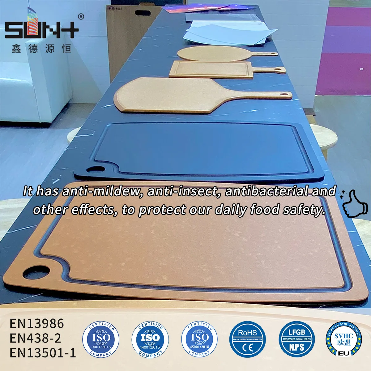 Food Grade Compact FDA is a specialized high-pressure laminate certified for direct food contact, manufactured to meet stringent FDA regulations (CFR 21 Part 177.1460) and NSF/ANSI 51 standards. The production process uses food-safe phenolic resins and specially selected kraft paper layers, laminated under controlled conditions (140-160°C, 100-120 kg/cm²) to create a completely non-porous, homogeneous core. The surface features a smooth, sealed finish that prevents bacterial colonization and fluid penetration. With antibacterial efficacy of 99.9% (tested per ISO 22196 against E. coli and S. aureus), this product ensures maximum food safety. The dense core (≥1.40 g/cm³) provides excellent impact resistance for heavy kitchen use, while the chemical-resistant surface withstands food acids, oils, and commercial cleaning agents. Zero migration of harmful substances ensures food safety compliance. Available in thicknesses from 12mm to 25mm, specifically designed for commercial kitchen countertops, food processing facilities, restaurant prep areas, and any surface requiring direct food contact certification. Meets international food safety standards including EU 10/2011, FDA CFR 21, NSF/ANSI 51, and GB 4806.1-2016. Heat resistant up to 180°C, stain-resistant, and easy to sanitize for daily food service operations.