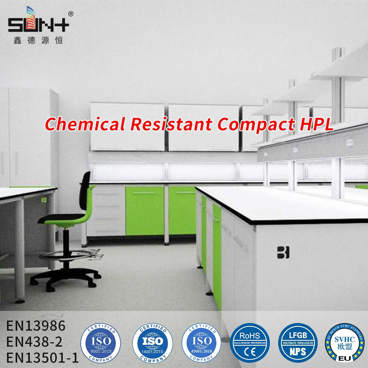 Chemical Resistant Compact Board (理化板) is a high-performance decorative panel manufactured through high-pressure lamination technology. Multiple layers of kraft paper impregnated with phenolic resin are compressed under heat (150°C) and pressure (1430 PSI/100 kg/cm²) to create a dense, homogeneous core. The surface features a specialized chemical-resistant overlay that provides exceptional resistance to acids (pH 1-3), bases (pH 11-14), and organic solvents. This advanced manufacturing process results in a non-porous, self-supporting panel with superior mechanical strength and chemical durability. Ideal for laboratory countertops, hospital furniture, pharmaceutical facilities, and industrial workstations where chemical exposure is frequent. The product meets international standards including EN 438, NFPA 286, and GB/T 7911-2013.